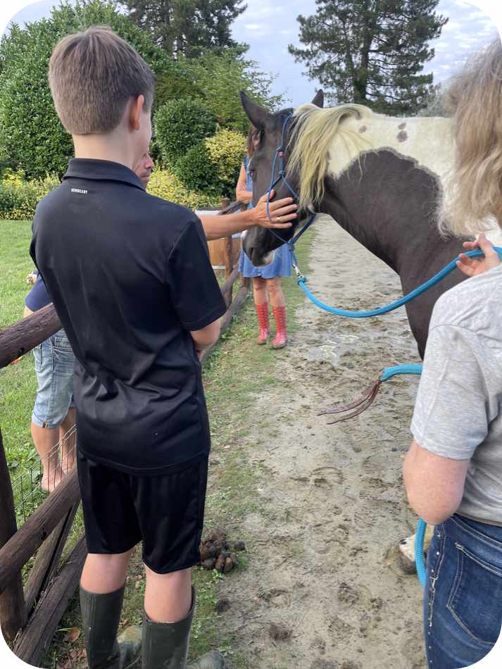 Tijdens een ontspanningssessie kom je uit je hoofd in het hier & nu door in de natuur bij de paarden te zijn, te knuffelen, te borstelen, te ademen, ... Voor kinderen vanaf 6 jaar, jeugd en volwassenen. Maximaal 4 deelnemers per sessie.