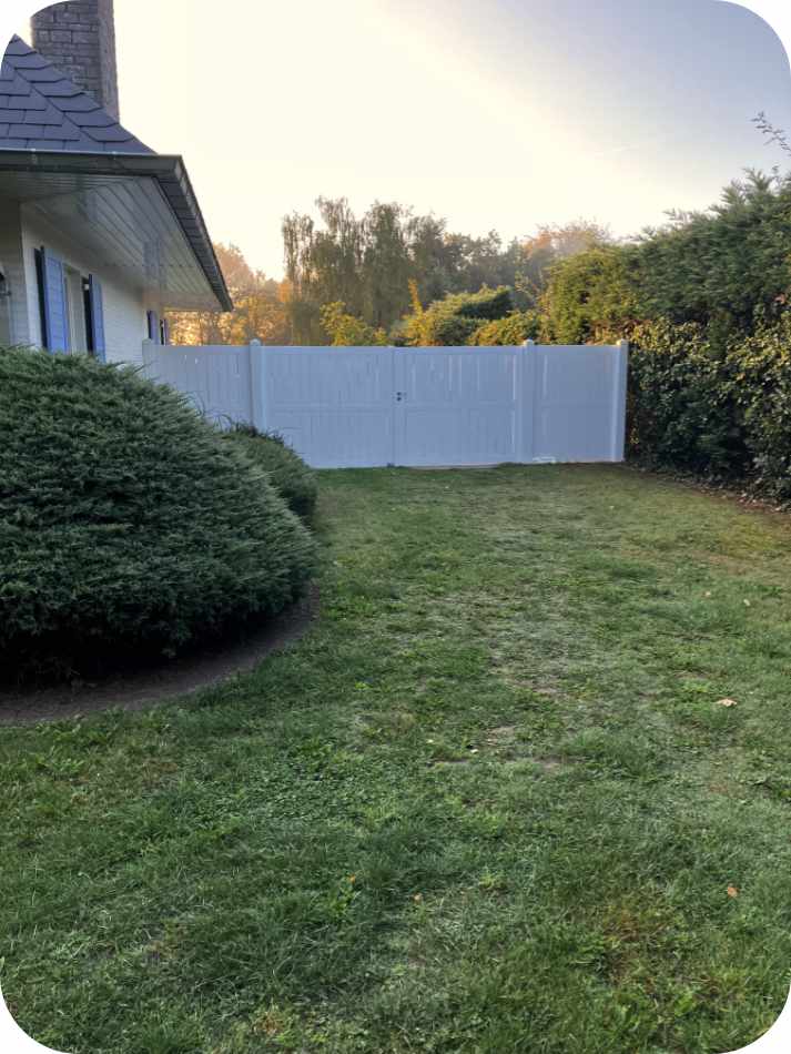 Grote witte poort rechts van de woning. Gelieve deze poort steeds opnieuw te sluiten.